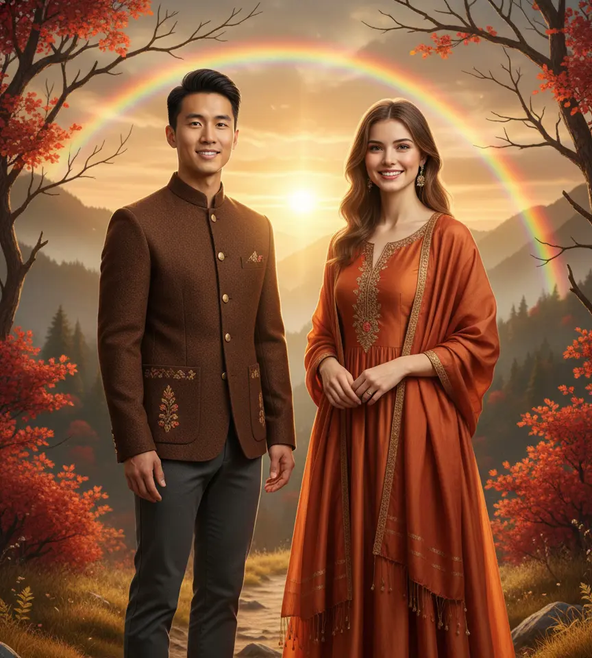 Our nature AI uses neural depth mapping to ensure your couple portraits look naturally blended with mountain and forest backgrounds.